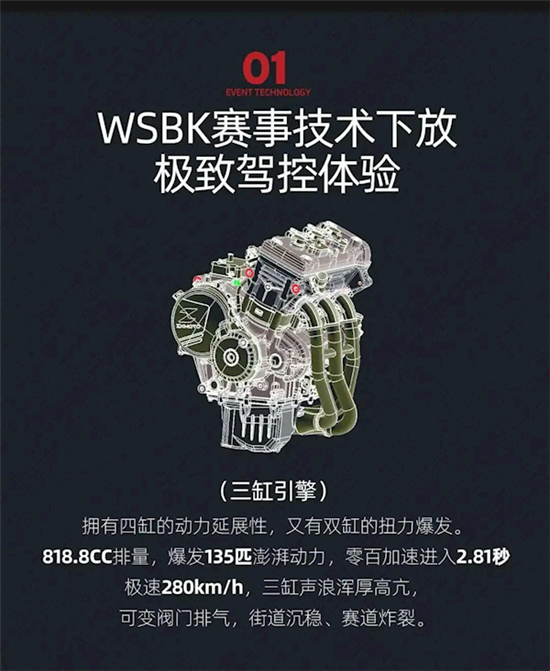 该车搭载818.8cc直列三缸水冷发动机,最大马力135匹,峰值扭矩85N·m,零百加速仅需2.81秒,极速可达280km/h。