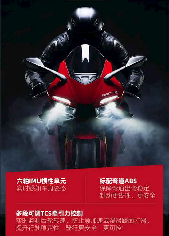 配置上,该车标配六轴IMU惯性测量单元、弯道ABS、牵引力控制、滑动离合等全套高端电控系统,搭配碳纤维风挡、铝合金后摇臂等轻量化部件。
